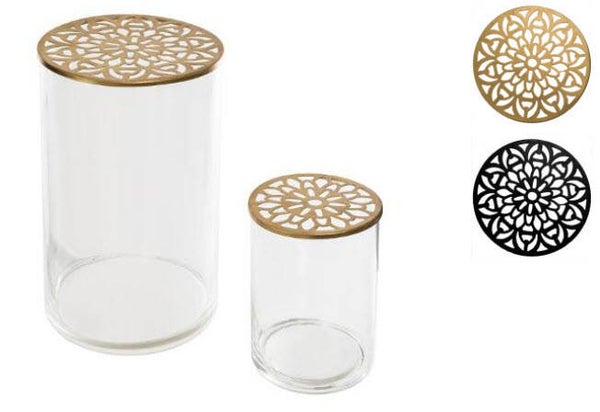 Deze vazen zijn voorzien van een gouden deksel met decoratieve openeningen, waar je bloemen doorheen kunt steken voor een unieke decoratie. Een paar gedroogde bloemen of takken benadrukken het vintage gevoel van dit vaasje. Leuk op zichzelf of in combinatie met de andere glazen vaasjes.